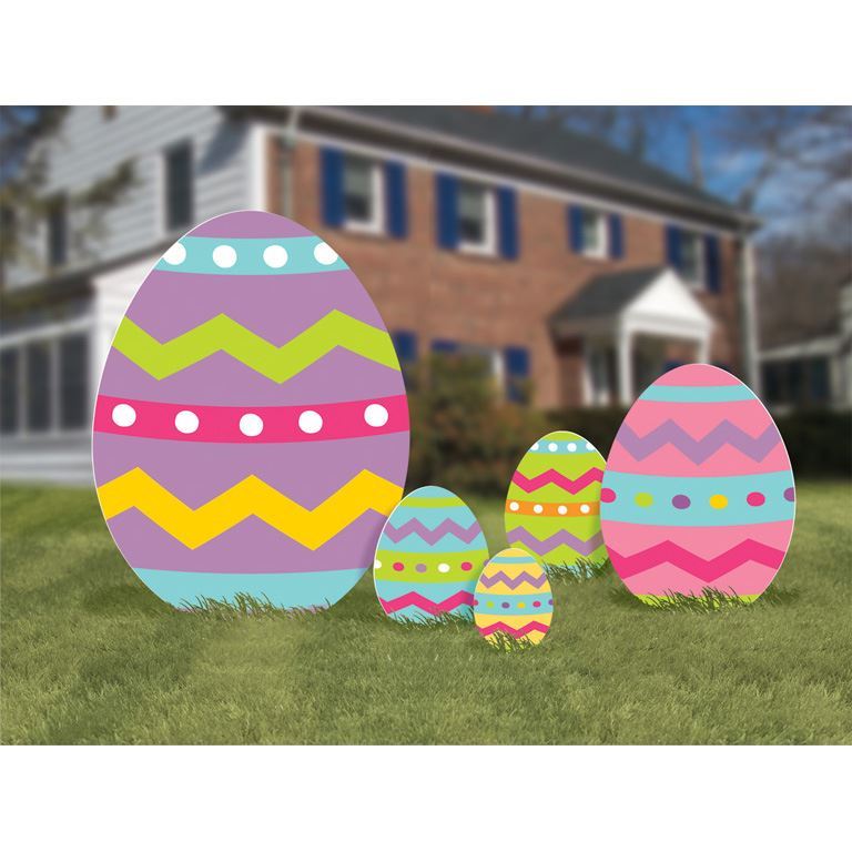 But the little ones will be astonished when they find these big, colorful easter eggs on the lawn. The eggs are decorated with great spring colors and decorated with decorative patterns . Dots , zig zag patterns and stripes decorate the five Easter eggs lawn mats . The Easter eggs made of cardboard vary in size: 1x 55cm 1x 34cm 2 x 20cm 1x 13cm