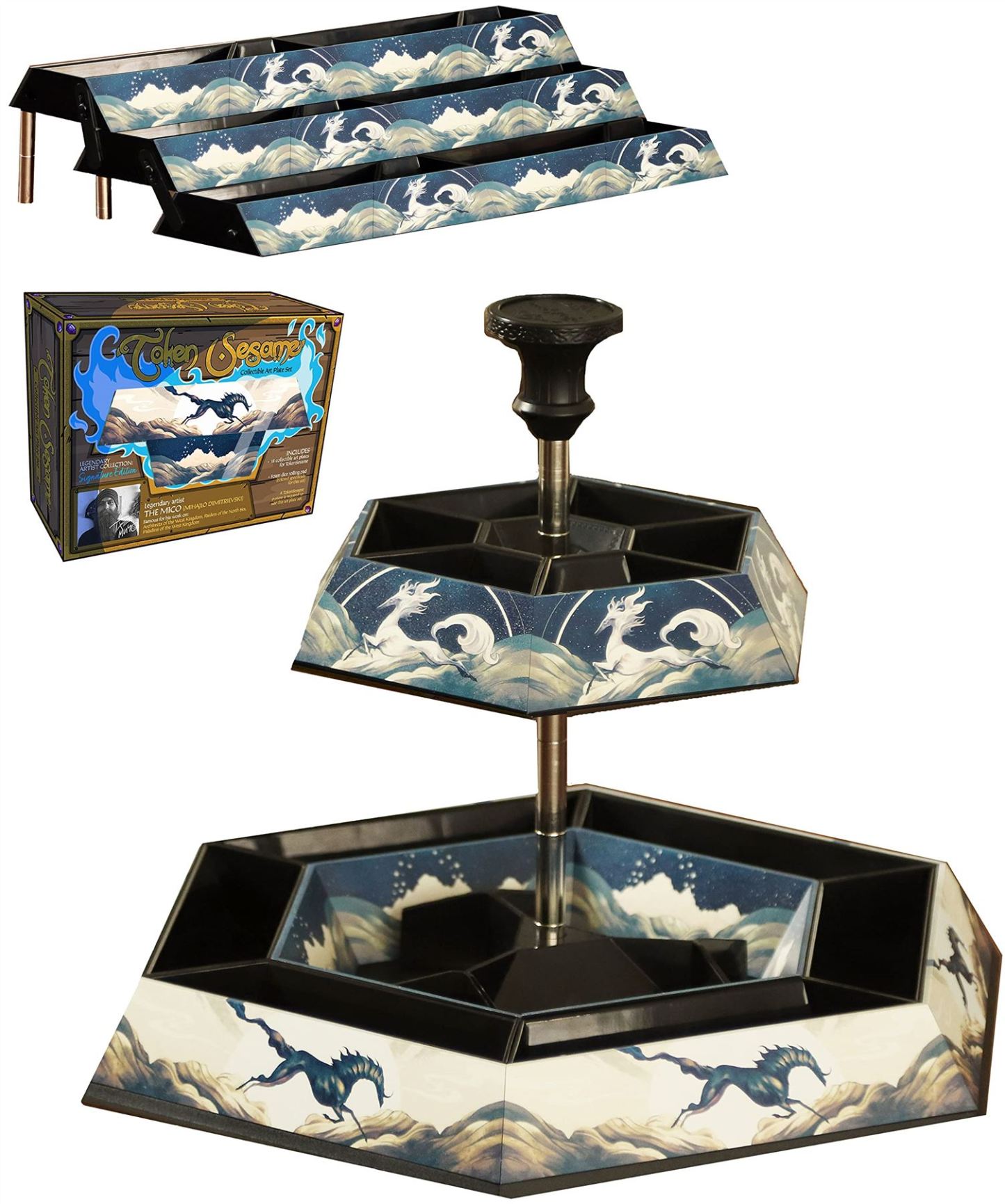 MODULAR, click-together chambers allow you to make hundreds of combinations. SAVES table space with vertical stacking design. ADAPTS to any board game from massive sprawling games to small card games. Includes DICE ROLLING tray and CARD DECK HOLDER modules. Packs up into a compact TRAVEL MODE, allowing you to setup your games ahead of time and unpack them in a flash. Features like grab handle and spinning tray mean no more stretching or reaching. Don with GORGEOUS art plates featuring designs from famous board game artists like Andrew Bosley, The Mico, and Alexandr Elichev. One set includes enough parts to make the Carousel, Staircase, and many more!