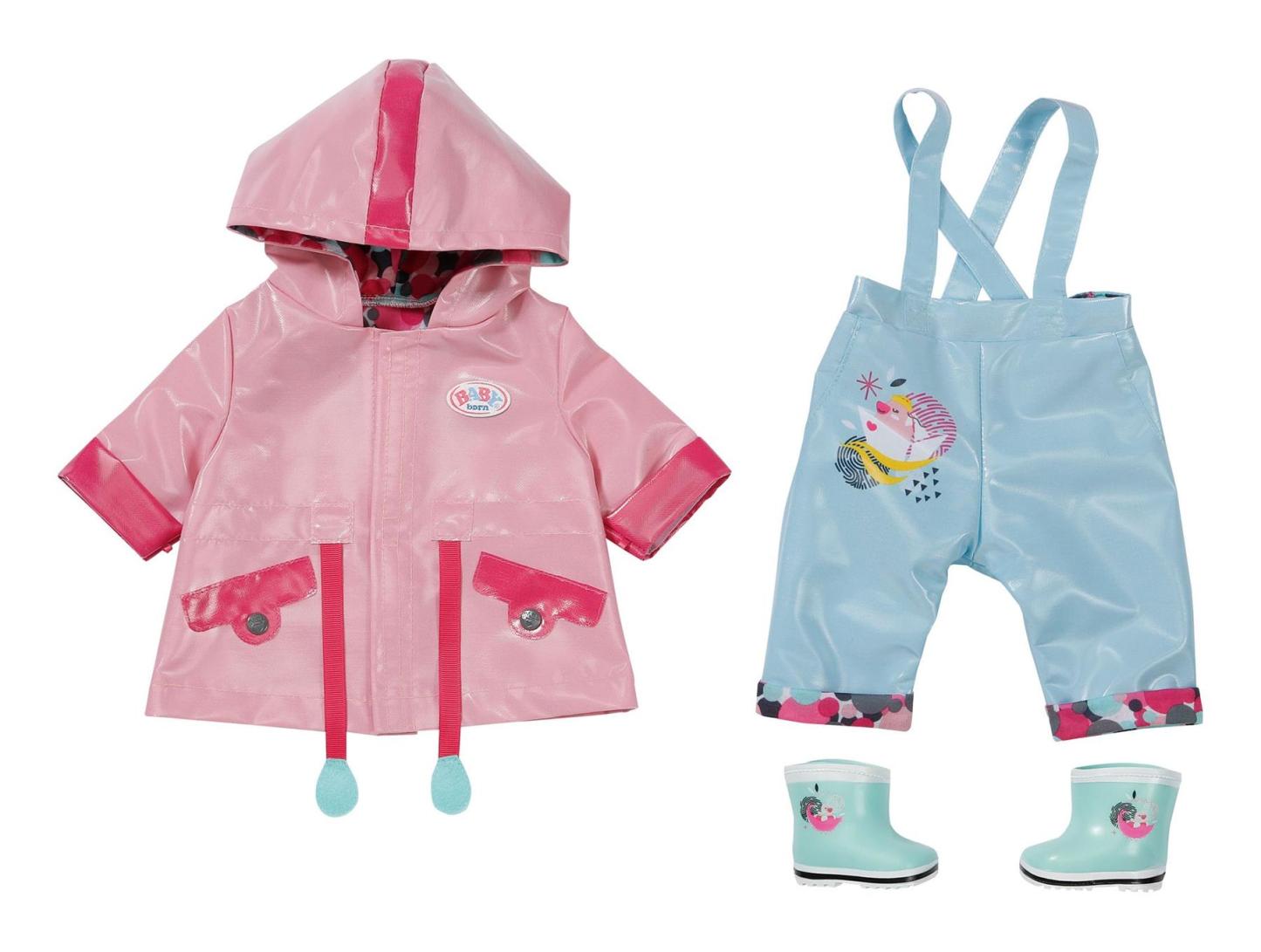 Splish, splash"BABY born loves jumping in puddles! Perfect for those April showers, this Deluxe Rain Set has everything your little one needs to dress BABY born for days outside, or pretend play inside"wherever their imagination takes them! The light pink rain jacket has a hood to keep BABY born cosy. There's a pair of blue overalls and, to complete the look, there's some mint-green Wellington boots - how cute! BABY born Deluxe Rain Set 43cm with raincoat, trousers and Wellington boots. To fit dolls up to 43cm. Suitable for children aged 3+.