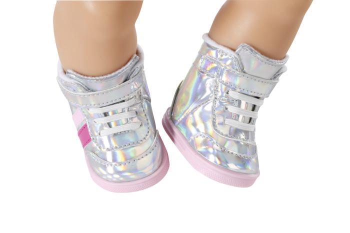 BABY born likes to wear the coolest shoes. These pink sneakers are super trendy with their silver holographic material and pink stripes down the side! With little laces and velcro straps, no detail is spared making sure she has the coolest shoes in town!