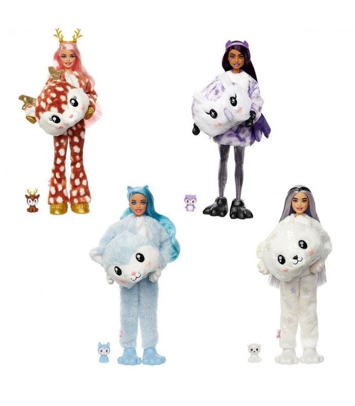 Please note: You will receive one random doll Barbie Cutie Reveal Snowflake Sparkle Series dolls offer the cutest unboxing experience with 10 surprises, including an adjustable Barbie doll! Unpack the package and find a soft, plush deer friend with gold foil antlers and four surprise bags. Remove the deer costume to find a Barbie doll with long pink hair and sparkling details. Open the surprise bags and find a cute skirt, a deer antler headband, a sponge comb and a mini deer. Kids can dress up and accessorize Barbie doll -- the top of the costume can be flipped over to become a super soft fleece jacket, and the head of the costume also transforms into a pet bed! The surprises continue with color-changing cuteness. Wintery 'snowflake' make-up appears on Barbie doll's face, and her pet deer 'opens and closes' his eyes - such a cutie! Just use the sponge comb and ice cold water to activate; switch back with warm water. Discover all the cute surprises with this winter-inspired Barbie Cutie Reveal series. Includes doll in animal costume and 10 surprises. Pop can't stand alone. Colors and decorations may vary.
