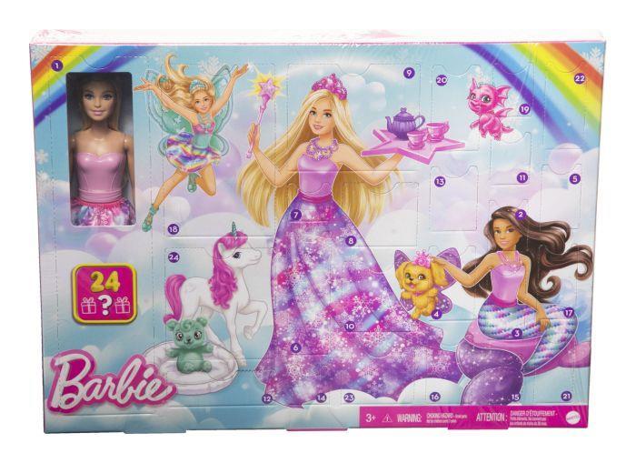 "This Barbie Dreamtopia Advent Calendar will delight kids with a fairytale Barbie doll and 24 gifts for a magical unboxing experience! "After discovering Barbie doll, enchanting mysteries await! Open a new present daily for 24 days to reveal spellbinding surprises like doll clothing and accessories. "Fashion pieces include 2 skirts, a pair of wings, and a mermaid tail, so fairytale lovers can dress Barbie doll up as a royal, mermaid or fairy. "Accessories include colourful shoes, headbands, necklaces, a wand and a hairbrush, all with fairytale-inspired details -- mix and match to create new looks! "Spark storytelling with additional surprises and inspire adventure with the four included pets: a puppy, bunny, baby dragon and unicorn!