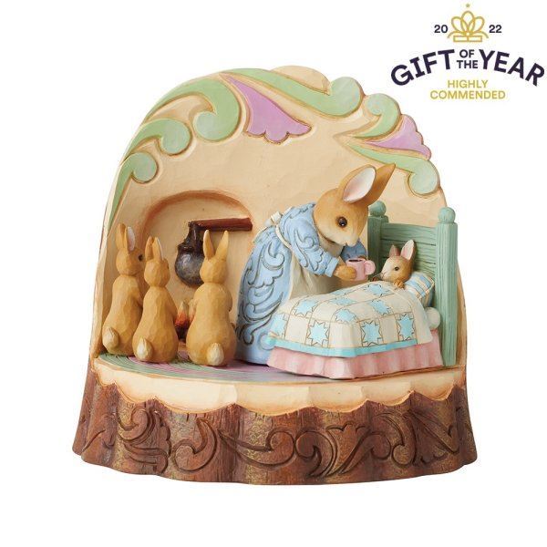 In this beautifully crafted figurine by Jim Shore, we get a glance inside the Rabbit household on a cozy night. Tucking her littlest bunny into bed, Mrs. Rabbit tends to sleepy child while her three other youngsters huddle excitedly by the fire.