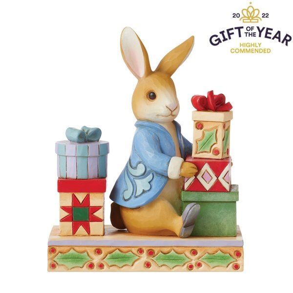 2022 celebrates Peter Rabbit's 120th anniversary. Jim Shore celebrates Beatrix Potter's lovable cast of characters with charming craftsmanship. This endearing figurine features the esteemed Peter Rabbit on Christmas day surrounded by handsomely packaged presents.