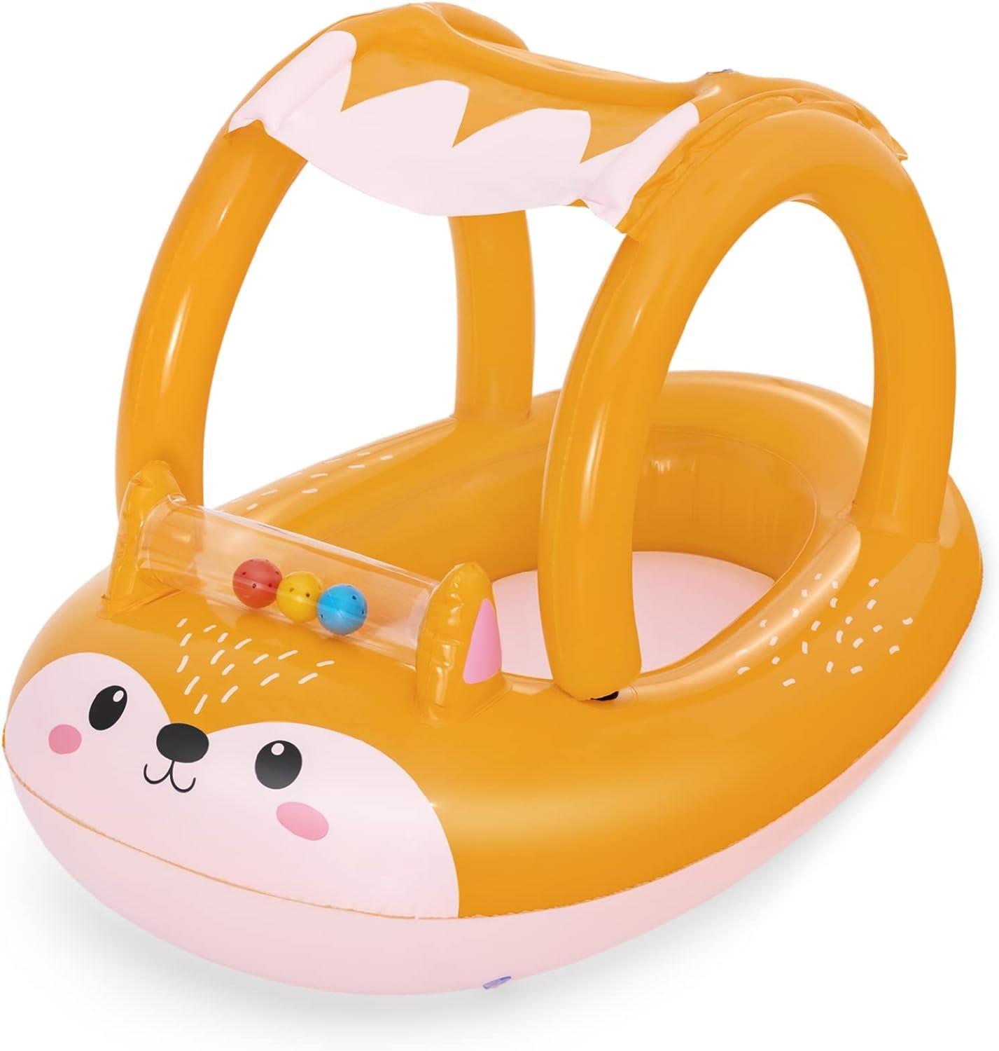 Floating just got a little more fun with the Bestway� Friendly Fox� Shaded Baby Boat. Designed for kids 3+, the boat features an enclosed tube with 3 moving, colorful balls that slide around as the boat moves and make a fun, tinkling sound to delight your little one. The boat also features a UV Careful� sunshade to protect your child as they splash and play. The shade is attached with velcro and can be easily removed for entry or exit, so your child is ready to float in minutes! They'll have a blast splashing, and you'll know they are safe as they play the day away in their Friendly Fox baby boat.