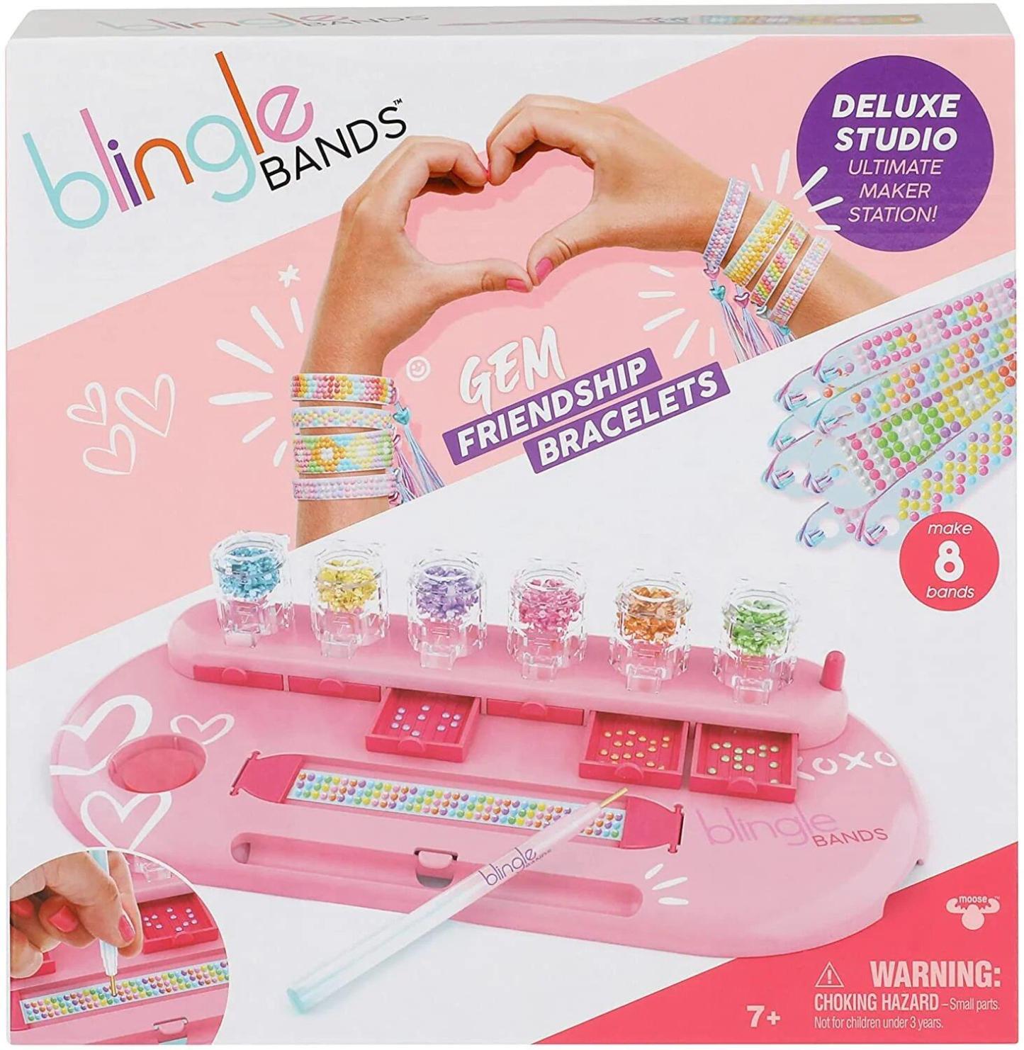 Share the Sparkle with Blingle Bands! Now you can make the most sparkly, fashionable Friendship Bracelets for you and all your besties! Just follow three easy and fun steps – DIP, DOT, BLING - to create in style with the Deluxe Studio Ultimate Maker Station! This stylish studio has been designed with everything in mind for any serious Blingle Bands creator. Built for easy use, the Deluxe Studio has heaps of great features including Quick Tap Gem Hoppers for speedy dispensing, Drawers to store and separate your Gems for easy selection, a Gem Bar grip to flip your Gems up the right way and a secure band snaplock feature. To make your Blingle Bands simply DIP your Blingle Pen into the wax, DOT your Gem onto your Blingle Pen and BLING your Gem onto the Band. There's no glue and no mess, just press, stick and make it bling! With 8 Bands included in the Studio you can either follow the fashion templates provided to create the coolest sparkling Friendship Bracelets around or let your creativity run wild and make your own unique designs! The Ultimate Maker Station is a super-fun Arts & Craft DIY Activity Kit that comes with exclusive iridescent Gems. Make them for yourself and make a fashion statement or make Blingle Bands for you and all of your besties! Make It Yours...with Blingle Bands!