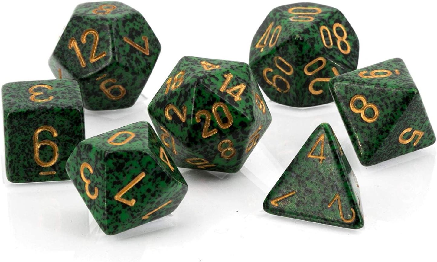 A set of seven high-quality, speckled polyhedral dice.