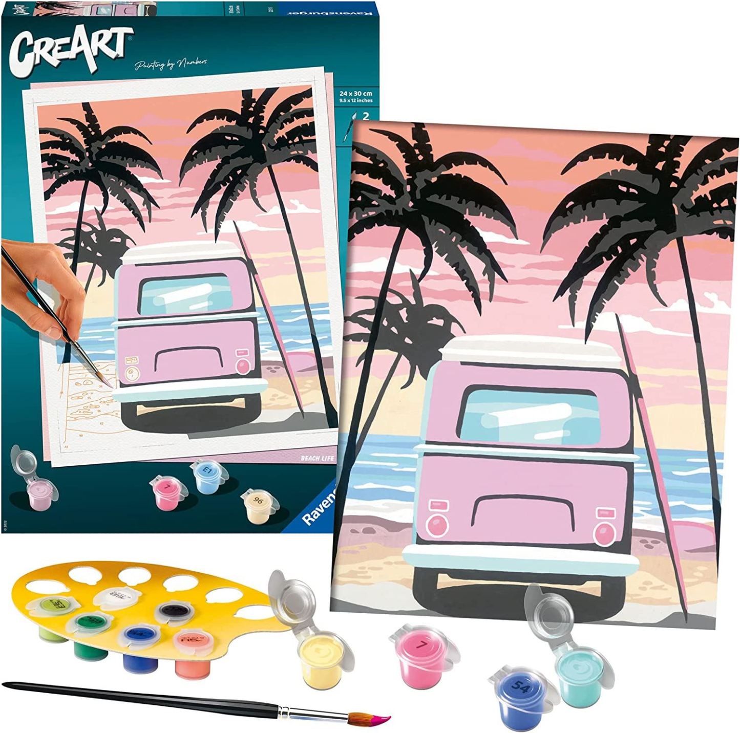 This colourful painting by numbers activity is sure to relax and satisfy "excellent arts and crafts for older kids and Adults. Coloured guide outlines distinguish between each colour, ensuring a picture-perfect result - brilliant paint by numbers for older children and adults. High quality thick painting canvas, 16 acrylic paints in numbered pots, easel to hold the pots, fine point durable paintbrush for detail painting, easy to follow guide sheet. CreArt paint by numbers sets make for a fantastic Christmas gift, birthday present or Easter crafts and activities for ages 12 years and up. This product is made of FSC-certified and other controlled material. By choosing this product, you are supporting responsible management of the world" forests. Canvas size measures 24 x 30 cm.