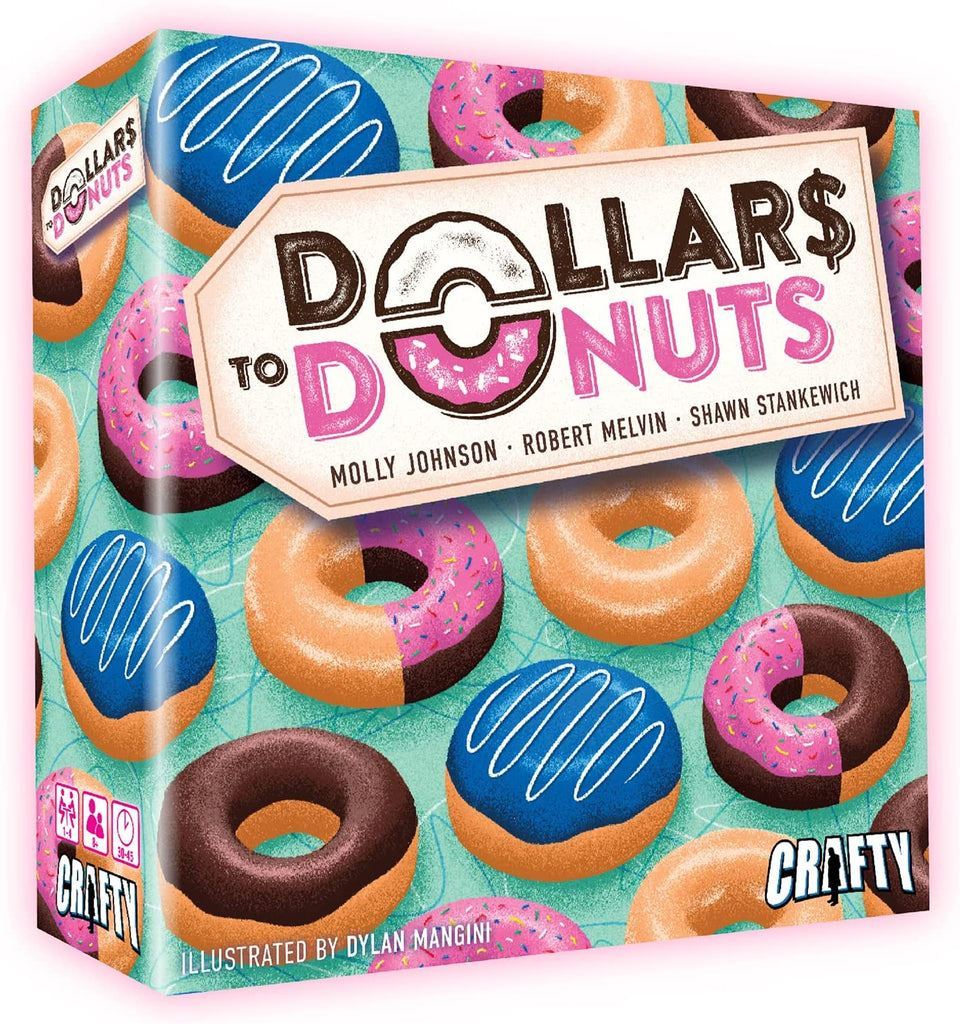 Dollars to Donuts is a puzzly, tile-laying game of donut deliciousness! Created by Flatout Games, designers the award-winning Point Salad (AEG), and beautifully illustrated by Dylan Mangini, this light strategy game is perfect for the entire family.