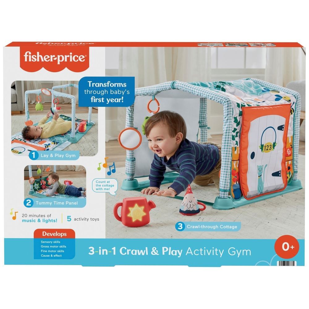 The Fisher-Price 3-in-1 Crawl & Play Activity Gym transforms through your baby" first year to keep playtime going as they grow up. First, the comfy play mat and overhead toys offer lay-and-play fun for newborns. Then, an extra panel folds up for tummy time fun with repositionable activity toys for engaging sensory play. Finally, the gym transforms into a cottage-themed, crawl-through tunnel with fun peek-a-boo surprises and a light-up musical toy watering can to "sprinkle" in some early pretend play.