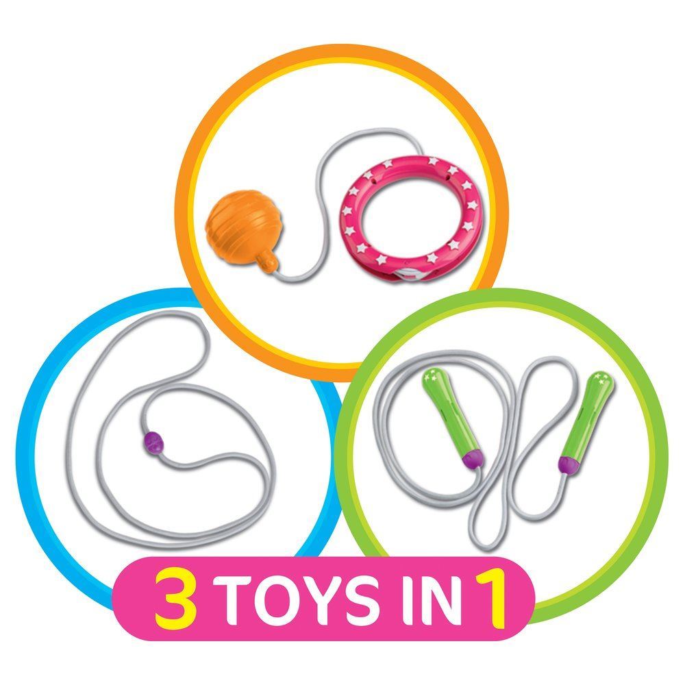 3 in 1 toy for outdoor play. Use as a skipping rope. Includes a ball and hoop for one player use. Connect the ends together to play with friends.