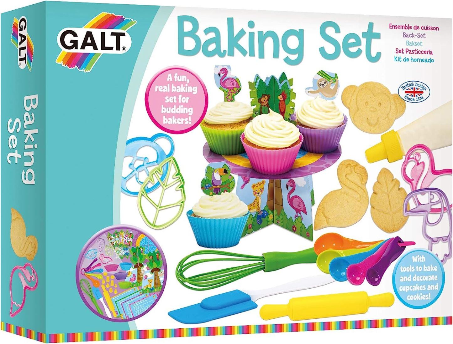 A fun, real baking set for budding bakers with bright, colourful utensils Bake cupcakes and cookies, then have fun decorating them using the icing set ready to display on the cake stand. 4 simple recipe cards included for vanilla and chocolate cupcakes, shortbread biscuits and vanilla frosting.