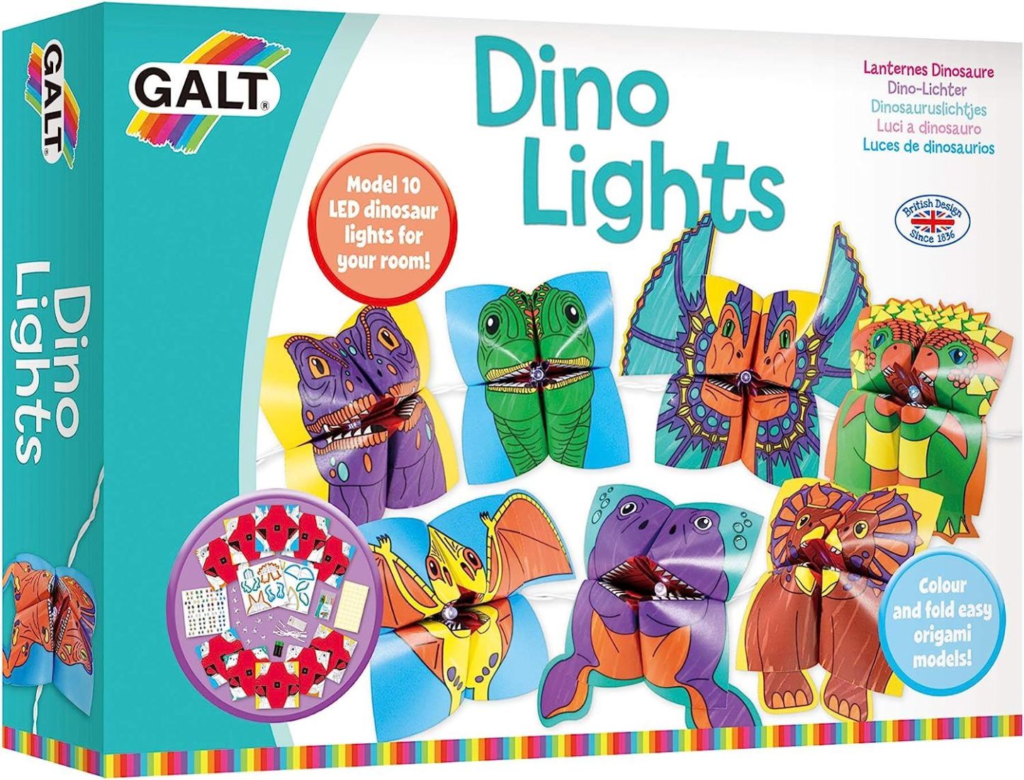Make a roar-some string of 10 dinosaur lights to brighten up any dino fan" room! Colour in the sheets of dinosaur origami paper and follow the step by step guide to fold them into snapping heads. Then, add stickers and body parts and use the clips/pegs to attach them to the lights for a prehistoric light show!