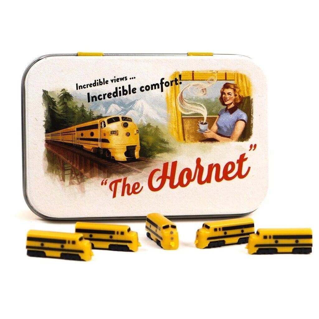 As Americans bought cars in record numbers in the 1950s, railroads tried to lure back passengers with luxurious, "uturistic"diesel trains. This Hornet train was influenced by these classic mid-century diesel locomotive designs. The Hornet" tin artwork mimics the Norman Rockwell style of 1950s American train ads. Contains 48 Hornet trains and 1 stackable score marker.