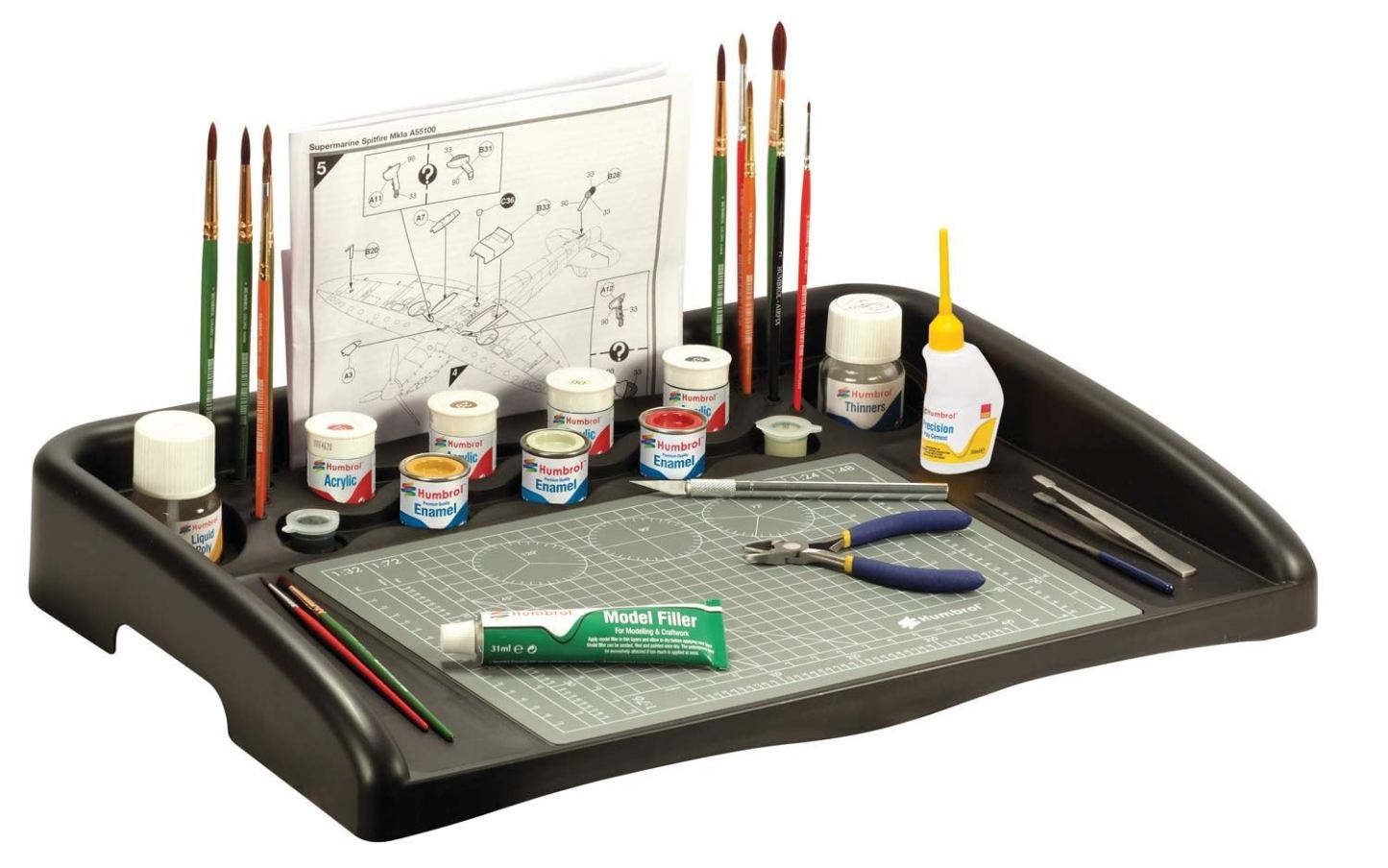 Double depth sections for holding 9 x 14ml Humbrol Enamel or Acrylic pots, 3ml Humbrol Acrylic pots, or 14ml dropper bottles. Double depth water cup holders, allow the modeller to place Humbrol 28ml products, such as; matt, satin & gloss cotes, Decalfix, Maskol, Clearfix, Thinners and Liquid Poly. Designed to fit the Humbrol A4 Cutting mat within the working area. Easy to hold handles either side of the Work Station. A4 Instruction sheet holder. Brush and tool holders. Please Note: Paints, brushes and other Humbrol products shown are not included.
