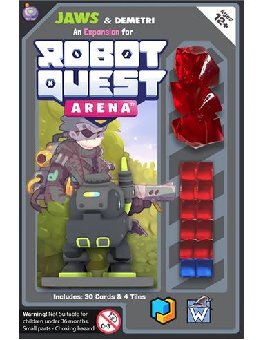 This expansion pack for Robot Quest Arena includes the Jaws robot mini and player board, 4 tiles, 20 Upgrade cards for the Shop Deck, a 10-card starting deck, 3 gems, 2 blue cubes, and 8 red cubes.