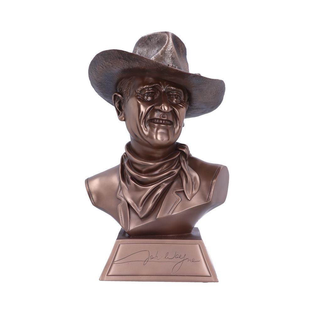 Saddle up pilgrim, it's time to ride. created by Nemesis Now, this high-quality bust of the Duke himself is cast in high-quality resin before being given a bronze finish. Captured in his role as Captain Jake Cutter (from The Comancheros), a rope is knotted around his hat as he looks ahead with an expression of gentle amusement. His neckerchief ties at the side, the bust extends to just before his shoulders. The stand has his famous signature etched into it. Perfect for any mantelpiece or coffee table, this bust is a fantastic way of showing your appreciation of classic westerns