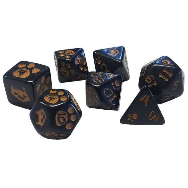 The purr-fect dice! Each set includes seven polyhedral dice: 1d4, 1d6, 1d8, 1d10, 1d%, 1d12, and 1d20. With Katie Cook's adorable kitty faces and paws you'll have the perfect mix of cute and curious!
