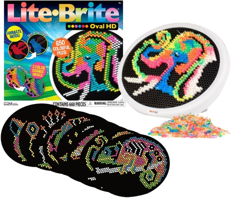 create beautiful pictures with... light! It�s just like you remember, but better than ever! Lite-Brite lets you create art with light using design templates and bright, colorful pegs - then lights it up like a neon sign. Enjoy creating beautiful light art with retro favorites like the Lite-Brite Ultimate Classic and Lite-Brite Retro Deluxe or enjoy a whole new experience with the ALL-NEW, MEGA-SIZED Lite-Brite Wall Art Pop Wow! Edition (great for displaying on your desk, tabletop, or as a work-from-home backdrop)! Each Lite-Brite comes with updated features like battery-powered LED lights that last for years and generate little to no heat! No more power cords or hot incandescent light bulbs that burn out! All Lite-Brite toys include pegs and design templates to get you started. Lite Brite Ultimate Classic