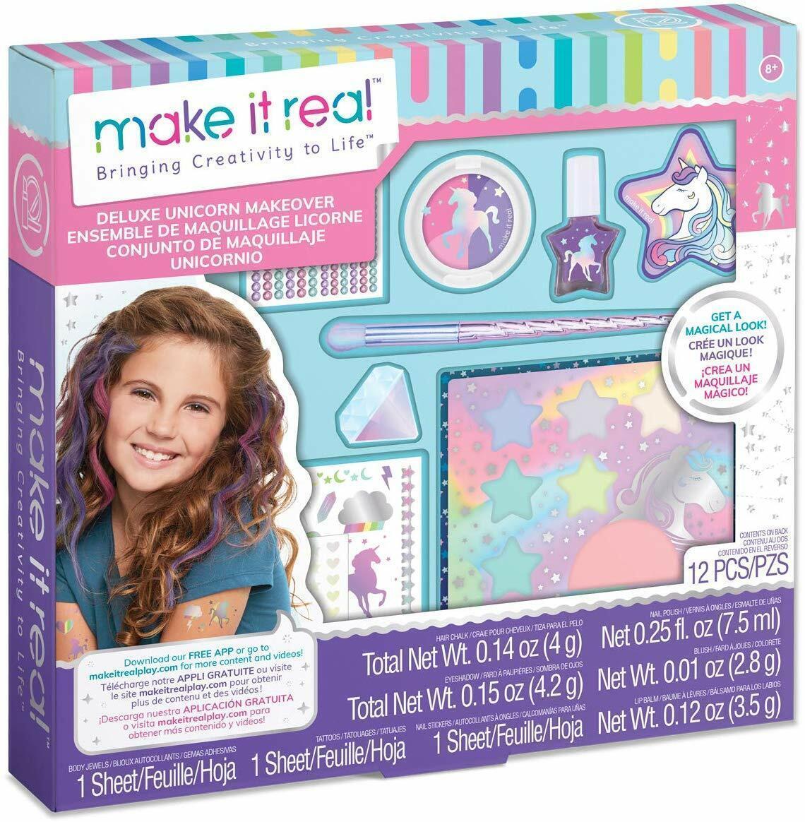 The possibilities are endless with this unicorn themed cosmetic set! It’s a perfect starter kit for your child to get creative and use their imagination for a fun makeover The Deluxe Unicorn Makeover helps young girls develop fine-motor, visual, and tactile-sensory skills - all while having fun, unleashing their creativity, and expressing themselves! This cosmetic set has everything your child needs to create a fairytale look. Includes 6 colors of eyeshadow, temporary tattoos, lip gloss, nail polish, nail stickers, nail file, gems, unicorn horn makeup brush Make It Real’s developmental toys make great gifts for girls and tweens, helping them to develop skills that will allow them to succeed as the future leaders and makers of tomorrow Ages 8+