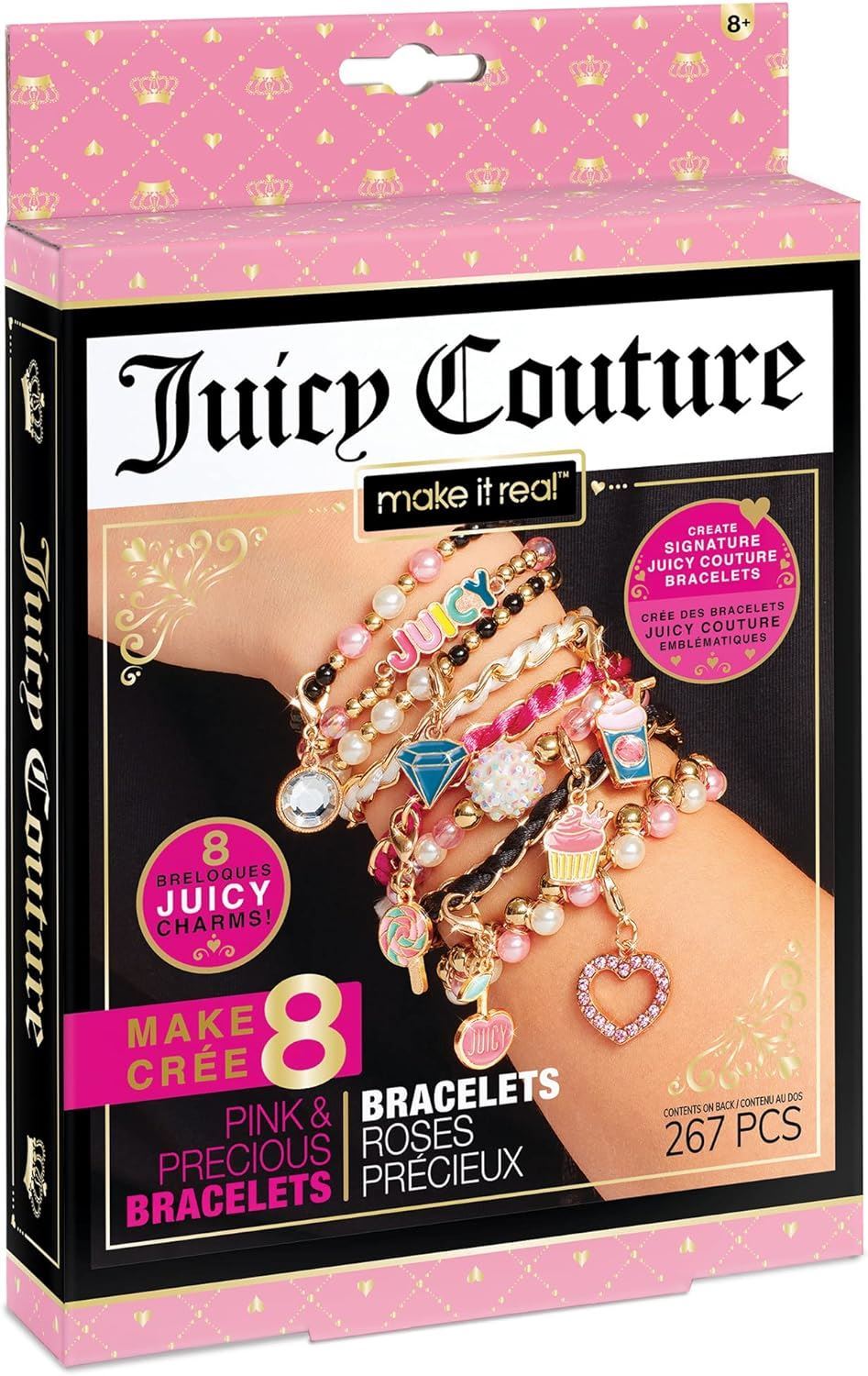 PERFECT FOR AGES 8+: The Juicy Couture Pink and Precious Bracelets kit includes everything your child needs to create fun and fashionable bracelets including 8 Juicy Couture charms, 210 colorful beads, 40 jump rings, 3 chains & 3 colors of satin cord