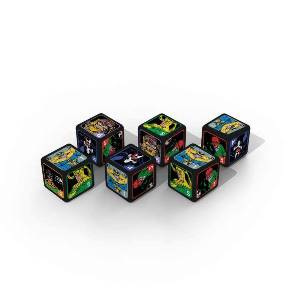 Take supervillains to your next game night with this Marvel universe-approved set of dice! This 6-sided dice set features your favorite planetary evildoers including Thanos, Venom, Doctor Octopus, Red Skull, MODOK, and Loki in classic Marvel comic style.