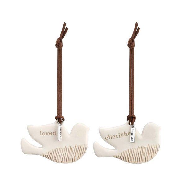 Mother and Daughter One to Keep, One to Share Ornament set reminds you of the eternal love between the giver and the receiver where they go. Each bird representing the Mother and daughter, keep one on yourself or hang it up in a special place. Give one in the gift bag and keep one for yourself. Each hanging ornament comes on backer card with a hole so these can be easily hung in store. These look great merchandised together