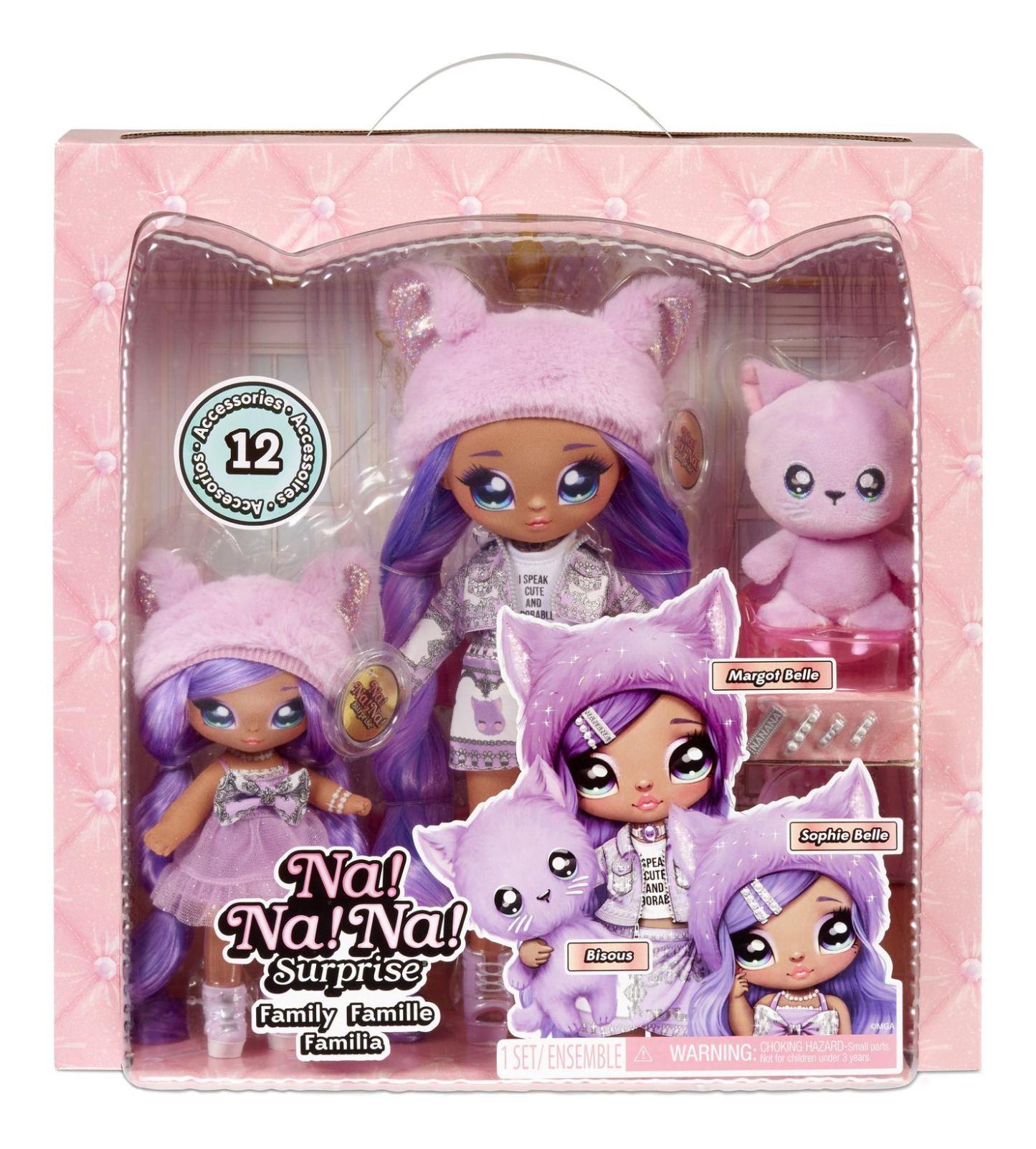 Collect the whole Na Na Na Lavender Kitty Family. Parisian chic inspired. Includes 11"Teens Soft Fashion Doll Margot Belle, her little sister 7.5"Doll Sophie Belle, and for the first time, their 4.5"plush pet cat Bisous. Dolls and pet are articulated and fully posable. Dolls have gorgeous, extra-long rooted hair and an adorable kitty-inspired brush is included for styling.