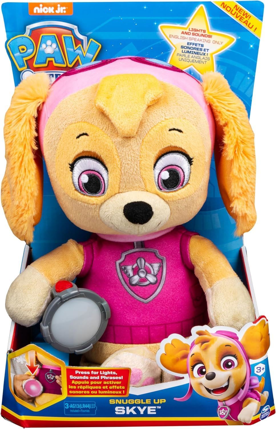 SUPER SOFT AND CUDDLY: Snuggle Up Skye will be your child" favourite part of bedtime or playtime Made of super soft materials, Skye is always ready for cuddles WORKING TORCH: Your child can go on night-time rescue missions with the working torch Simply push the button on Snuggle Up Skye" torch to activate Skye" pink lights, sounds and phrases BEDTIME SONGS AND PHRASES: Snuggle Up Skye knows over 10 sounds and phrases As your child cuddles up to Skye, she"l lull your child to sleep with soothing PAW Patrol lullabies PAW Patrol Snuggle Up Skye makes a great gift for kids aged 3 years and over. Requires 3 LR44 batteries (included)