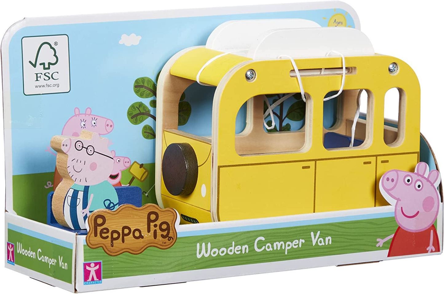 Classic peppa pig wooden push along campervan. Daddy Pig figure comes with drop n play feet. It can be easily dropped in driver seat slot. Chunky, durable, and ideal for small hands.