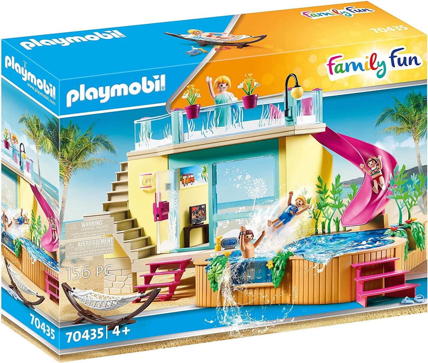 Holiday fun with the whole family: PLAYMOBIL bungalow with pool, slide, sun terrace, 4 tourists and accessories for detailed re-enactments. Bungalow with living room, bathroom and stairs to the roof terrace, attachable stairs for pool and entrance, entrance door unlockable with key card and much more. Playset for children ages 4+: Fits perfectly in children's hands due to age-appropriate size pieces, Easy to hold thanks to its rounded edges. Everyday use: instructions for assembly (with parents), High quality and robust design, To clean the parts (not including stickers), place pieces under running water containing no chemical agents. Contents: 1x PLAYMOBIL Family Fun Bungalow with Pool, 156-piece play figure set with instructions: 1 bungalow, 1 pool, 4 figures, 150 accessories, Material: plastic, LxDxH: 43x35x22 cm (without lamps), Weight: approx. 1.074 kg, 70435.