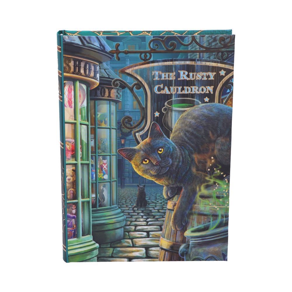 From the untamed imagination of Lisa Parker, comes this rusty cauldron journal. Sat on top of a rustic barrel outside of the rust cauldron, this mystic kitty stares inquisitively at you with its piercing eyes. Whilst behind him on the cobbled road, another can be seen gazing forward, taking in its surroundings of the magical highstreet they find themselves on. Made of high-quality paper, this portable journal is perfect for writing down your magical adventures.