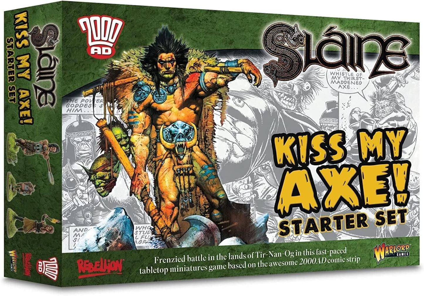 Sláine: Kiss My Axe! is a skirmish tabletop miniatures battle game for two or more players set in the fantasy world created by the legendary comic creators Pat Mills and Angela Kincaid. Axes and swords clash whilst Earth and Sour magic lash out across the