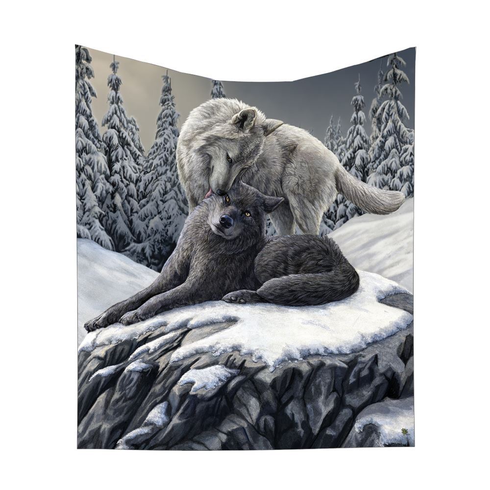From the untamed imagination of magical artist Lisa Parker, this enchanting and luxurious throw was created by alternative brand Nemesis Now. In a snow-covered forest beneath an overcast sky, a dark grey wolf lies calmly, their tail curled next to them. A white wolf stands over them, leaning down to lick their face - a show of affection the grey wolf accepts stoically. Not only is this throw laced with idyllic imagery it is also magically soft, making it perfect for any chair or sofa.