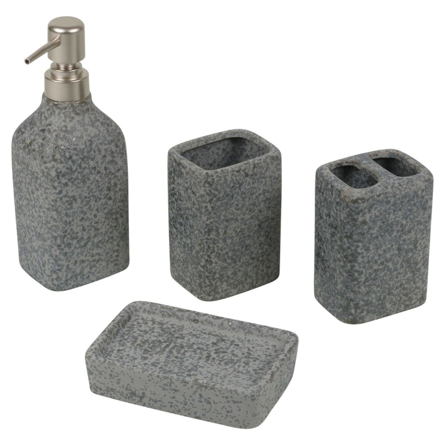 A beautiful 4pc stone bathroom set. This bathroom set comes with a soap dispenser, a soap dish, a toothbrush holder and a mug. The bathroom set is made from grey speckled stone and gives the set a natural feel.