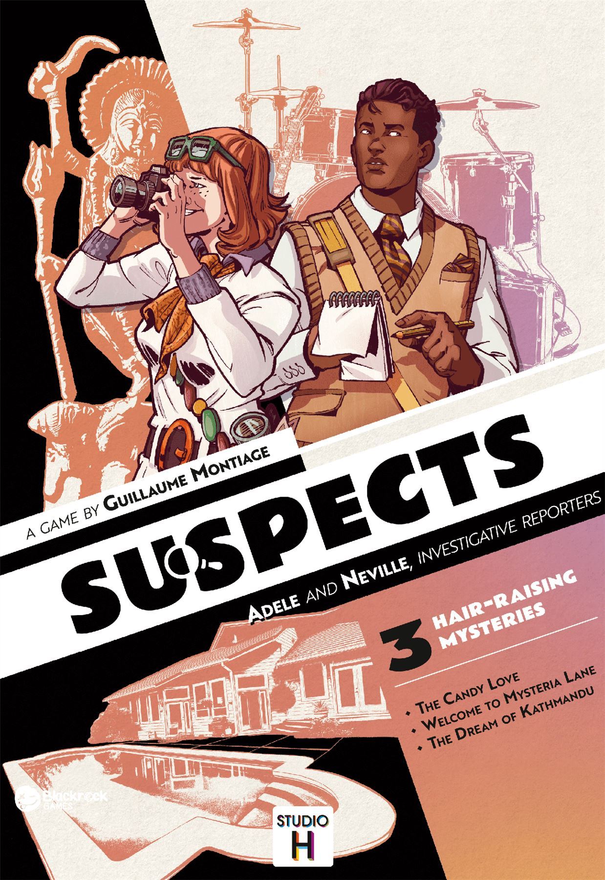 In Suspects: Adele and Neville, Investigative Reporters, the third chapter of the Suspects line, players embody Adele and Neville, a pair of investigative reporters tasked with solving intriguing murder mysteries. A match made in heaven on the scene of the crime and in their personal lives, Adele and Neville met in New York, studying journalism at Columbia University. While Adele is passionate about capturing moments in photos, Neville prides himself on writing ever more impactful articles. In the heart of the 1960s, this couple travels around the world to document the events of their time...and solve the mysteries they encounter. United in the face of mysteries and crimes, investigative reporters Adele and Neville have only one credo: publish the truth! In each chapter of Suspects, you read clue cards to progress through the plot like a book, discuss and reason amongst yourselves, and form hypotheses. Your goal is to score the most points when you answer the questions about the case. The "faster" you answer (i.e. having drawn and read as few clue cards as possible), the more points you score.
