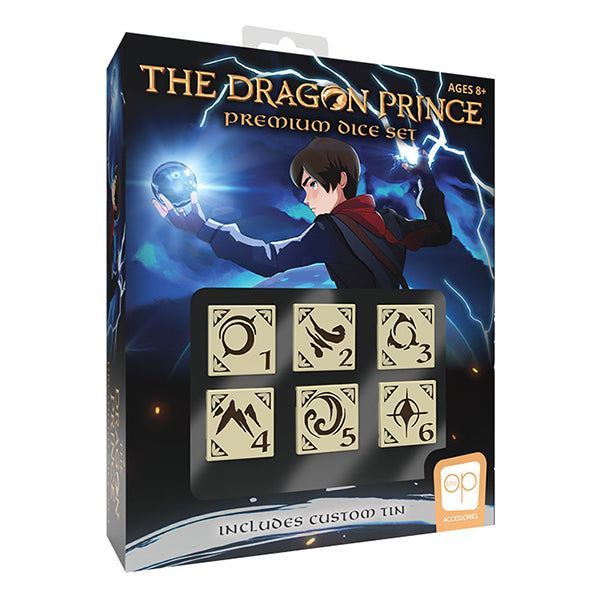 Take your very own primal cubes to the next game night with The Dragon Prince Premium Dice Set! This ornately designed and antique-washed 6-sided dice set features elemental symbols and numbers inspired by the Netflix Animated Series, all stored in an embossed tin carrying case resembling Callum's spell book.