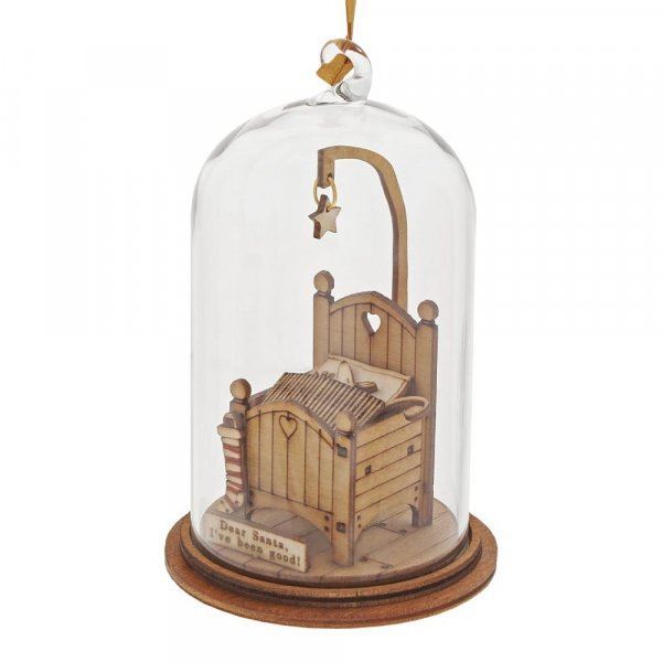 The Spirit of Christmas. A collection of delightful wooden decorations that capture the essence of that special time of year. This glass dome, Christmas decoration encases a cosy bed on Christmas eve, adorned with a stocking ready for Santa and finished with ribbon to help hang off your Christmas tree. This classic vintage style, decorative Kloche will make a stunning display in your home. Material: Glass with a wooden base. Packaging: Presented in a branded unique giftbox.