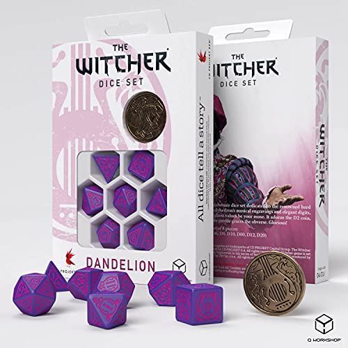 Witcher Dice Set. Dandelion - The Conqueror of Hearts His words melt ice and hearts. Inspired by The Witcher franchise, this dice set is dedicated to Dandelion "a bard who charms with every syllable. The set contains 8 pieces; 7 polyhedral dice, and a metal coin featuring Dandelion" depiction, which acts as a D2. Each die is painted purple with pink engravings. The highest value faces and coin reverse display Dandelion's favored lute. The Witcher Dice Set is officially licensed by CD PROJEKT RED.