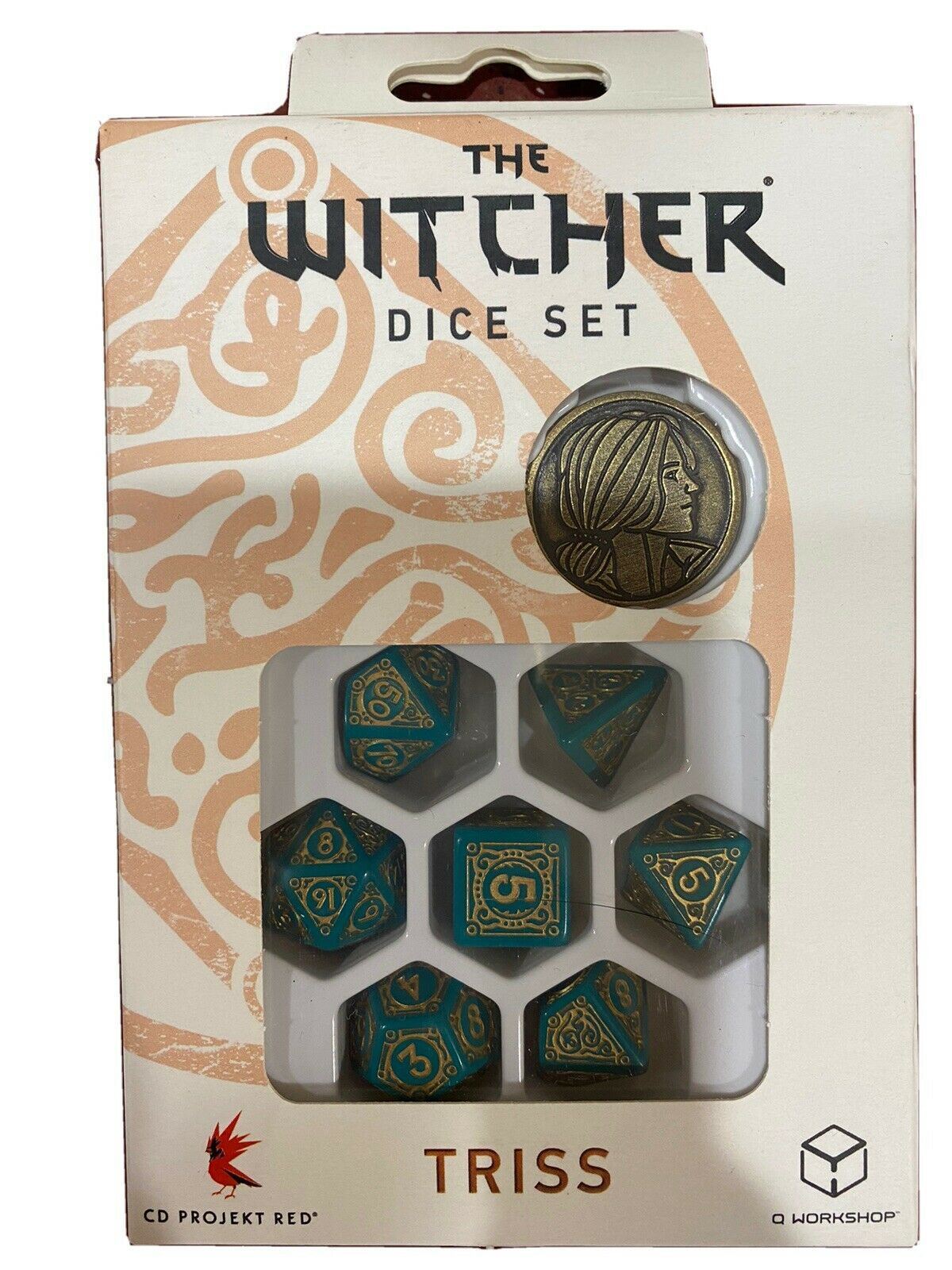 A remedy from a friend. Inspired by The Witcher franchise, this dice set is dedicated to Triss Merigold of Maribor "the skilled healer and alchemist. The set contains 7 polyhedral dice, and a metal coin featuring Triss"depiction. Each die is painted turquoise with golden engravings. The highest value faces, and coin reverse, share imagery with Triss"pendant.