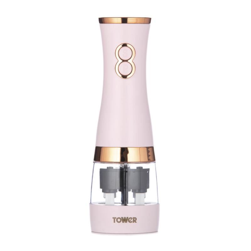 Tower's electronic duo salt and pepper mill in pink and rose gold are a must-have essential for your dinner table. The elegantly designed duo mill includes a battery-operated mechanism that adds a touch of class to any evening meal. Featuring an adjustable grinder function, you can choose whether to have fine or coarse salt and pepper seasoning suited to your taste. The clear acrylic chambers in the main body offer viewing windows so you can keep an eye on the level of the contents for a top up and for added convenience. You only need to press a button for the mill to operate for effortless usage.