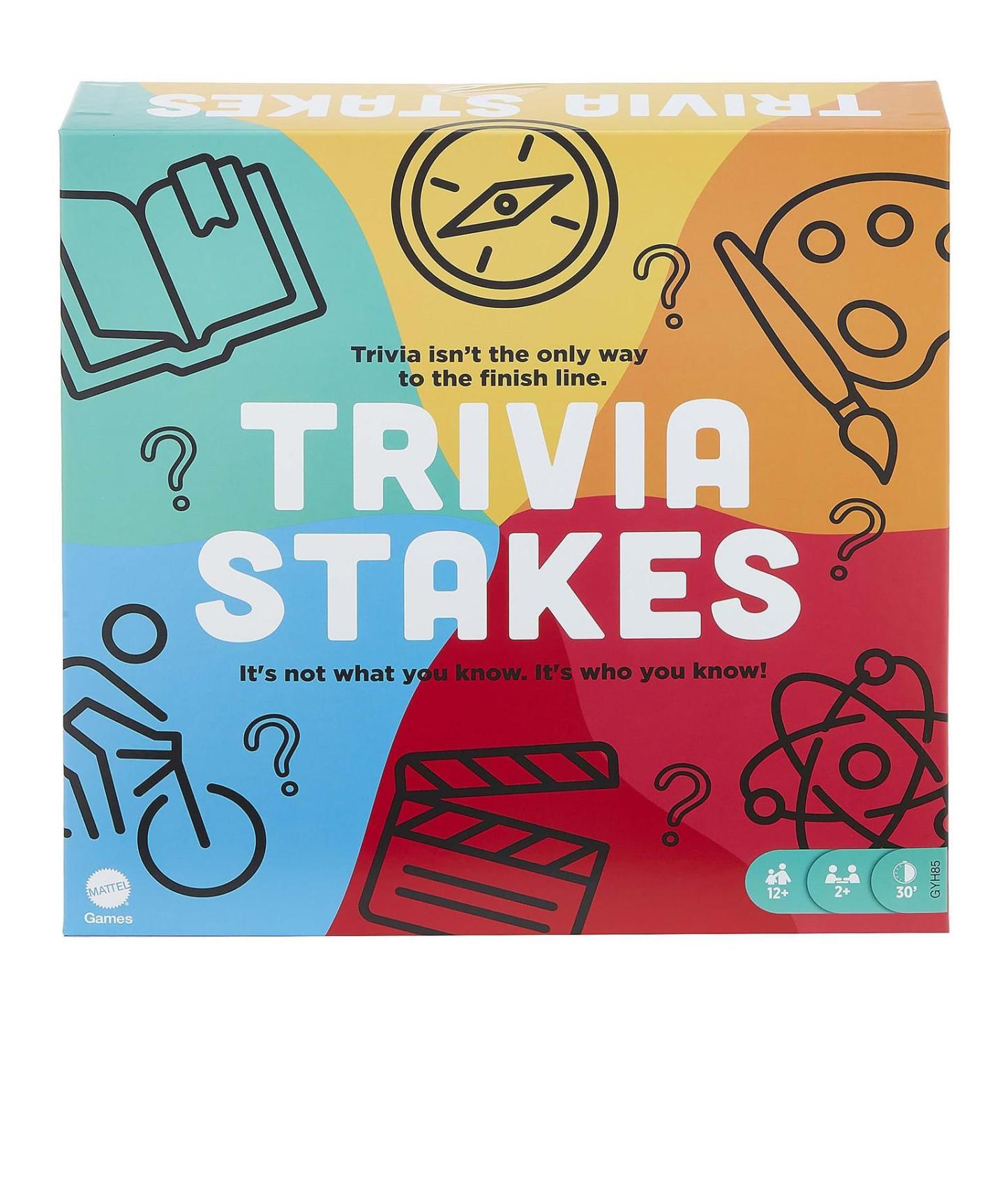 Trivia Stakes is the exciting board game of knowledge and wagers! Players answer trivia questions, but it's not just a trivia game. Correctly placed wagers also give players an extra chance to advance! Play as individuals or in teams to move across the board. The active player spins for a category, draws a card and reads the question out loud. All players write their answers down on dry erase boards. But before the answers are revealed, everyone uses their wager token to choose whether the other players answered the question correctly. Move one space for a correct answer and one space for if you wagered wisely. Be the first to reach the finish space and win! Trivia Stakes brings big trivia fun to any game night or party. colours and decorations may vary.